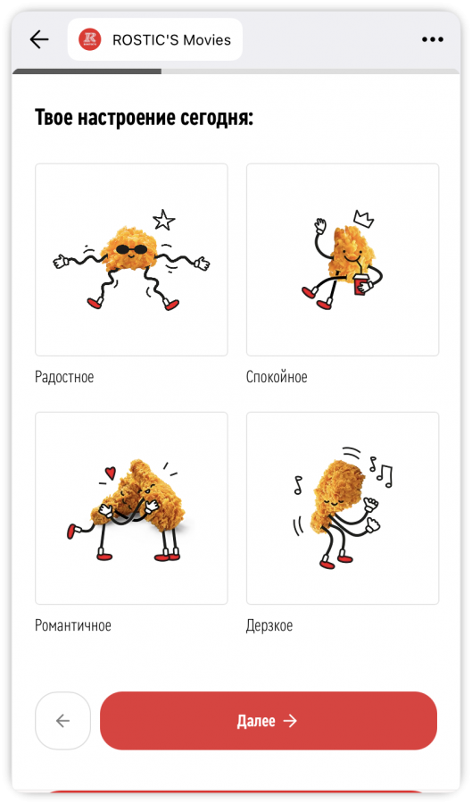 В рамках новой рекламной кампании «Настроение есть!» бренд запустил мини-приложение ROSTIC’S Movies в Telegram, закрепляя это позиционирование на территории кино. Мессенджер привычен аудитории, а формат Mini App открывает простор для легких интерактивных механик и позволяет пользователям выбрать фильм на вечер вместе с подходящим настроением.