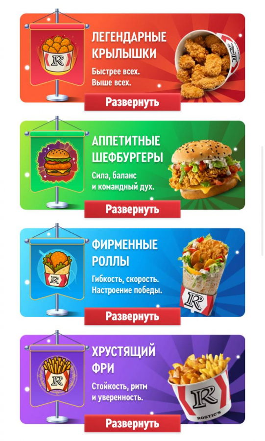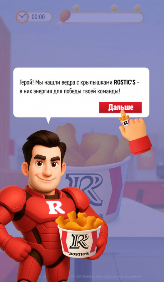 В процессе создания проекта мы стремились решить несколько задач: создать вовлекающий, интерактивный проект, где в процессе игры пользователь может не только провести весело время, получить призы, но и вспомнить о любимых продуктах от ROSTIC’S и заказать доставку фирменного ролла, аппетитного шефбургера.