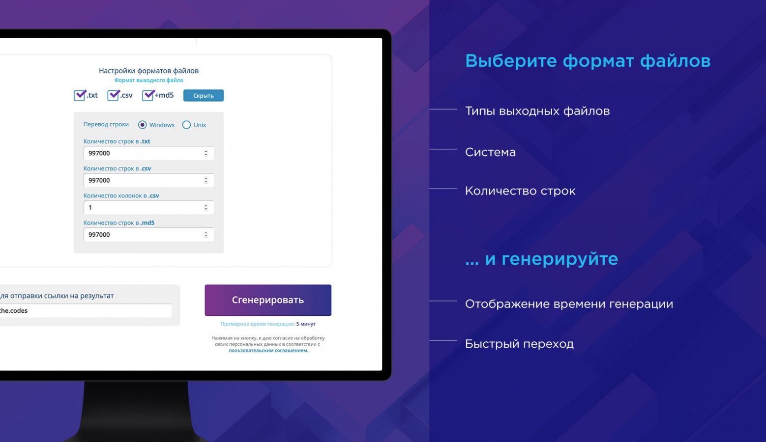 Так родился сервис TakeTheCodes, который позволяет за 30 секунд настроить все необходимые параметры (длину, набор символов, количество