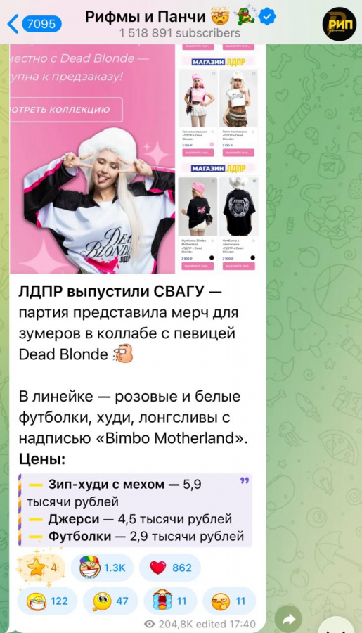 Недавно «Молодежь ЛДПР» представила коллаборацию с певицей Dead Blonde, исполнительницей хитов «Мальчик на девятке» и «Бесприданница». Это первый в России прецедент, когда политическая партия не просто наняла инфлюенсера, а интегрировалась в поп-культуру, создав полноценную линию мерча и заложив основы культурного коммьюнити.