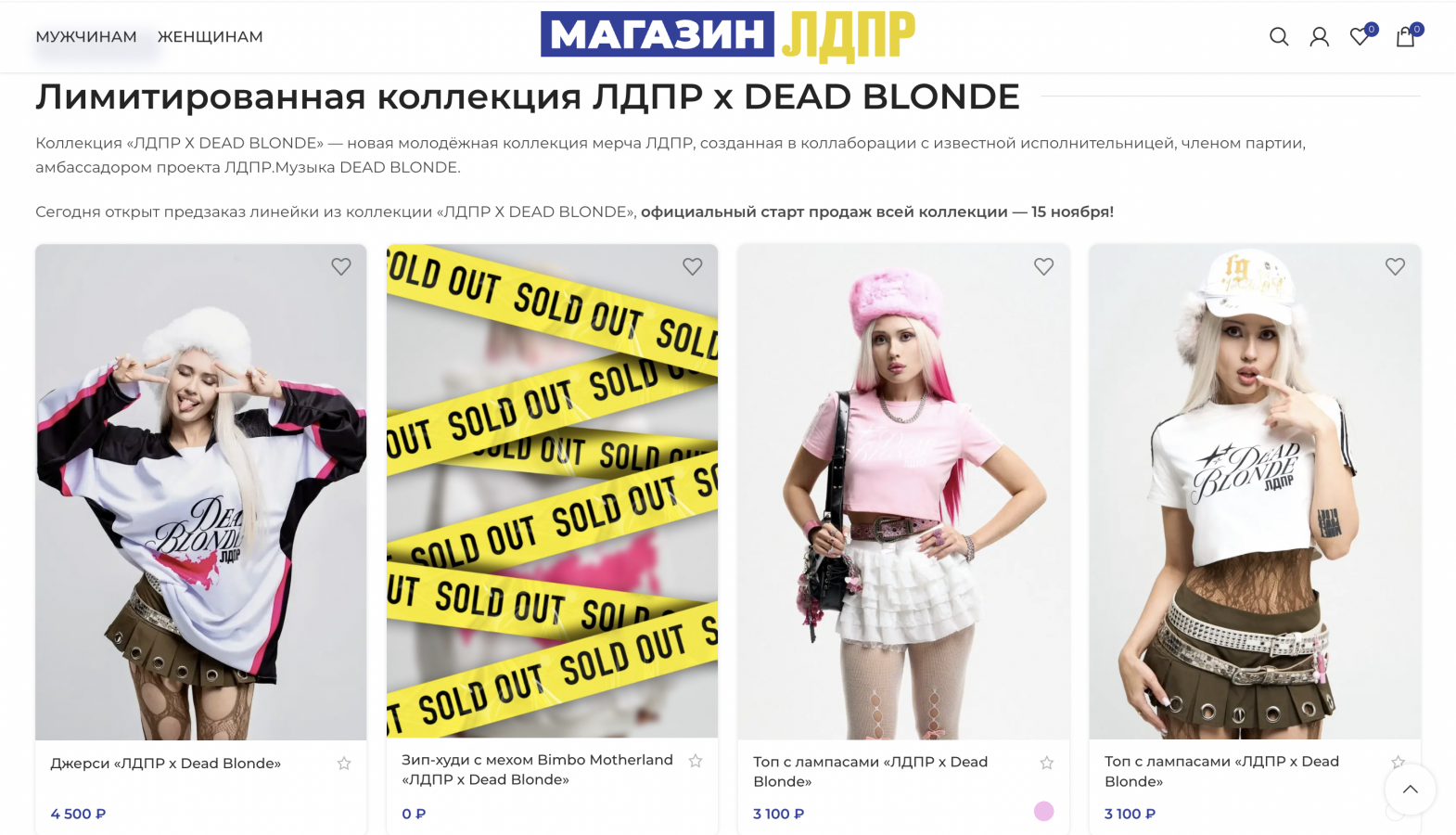 Арина Dead Blonde вступила в партию и выступала на мероприятиях, потом был запуск мерча во время ее сольного концерта, потом шло активное освещение в социальных сетях, а коллекция появилась на сайте магазина ЛДПР по предзаказу — все это создавало устойчивый информационный шум и ощущение живого процесса.
