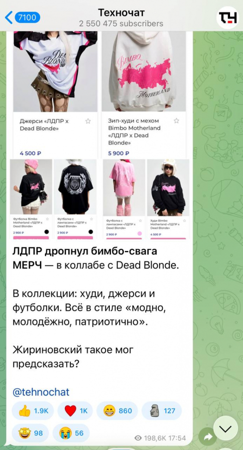 Сотни публикаций в крупных тг-каналах и у инфлюенсеров, нативные комментарии от пользователей социальных сетей в духе «- Розовый на мужчинах — это нормально? — Только если это мерч от ЛДПР», активные обсуждения в X и обзоры в Reels. Если говорить о политической конкуренции, особо бурно на коллаборацию среагировали либералы в уже упомянутой социальной сети Х. Они явно не ожидали от ЛДПР такого подхода.