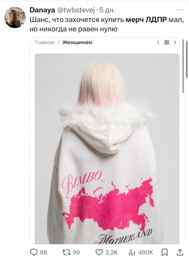 Нас постоянно спрашивали, какое внешнее агентство разрабатывало дизайн. Отвечаем: это полностью наша работа. Мы сами проходим весь путь — от идеи до воплощения. В коллекции «ЛДПР х Dead Blonde» мы хотели совместить дерзость и патриотизм, сделав их не противоречащими, а дополняющими друг друга понятиями. Розовый цвет и «бимбо-эстетика» — это наш способ говорить о серьезных вещах без пафоса, с иронией и стилем.