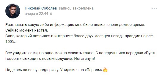 Накануне на своей страничке в VK блогер Николай Соболев сообщил подписчикам, что станет новым ведущим шоу «Первого канала» «Пусть говорят».