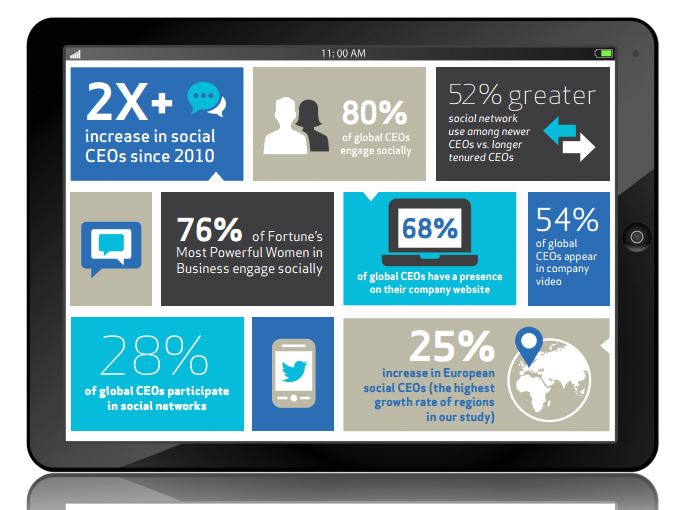 Агентство Weber Shandwick изучило активность топ-менеджеров крупнейших компаний в социальных сетях. Согласно исследованию, в 2014 году ими пользовались 28% гендиректоров, причем самыми популярными сайтами являлись LinkedIn (22%) и Twitter (10%). «Новички» CEO используют соцсети в 1,5 раза чаще, чем те, кто долго находится на руководящем посту.