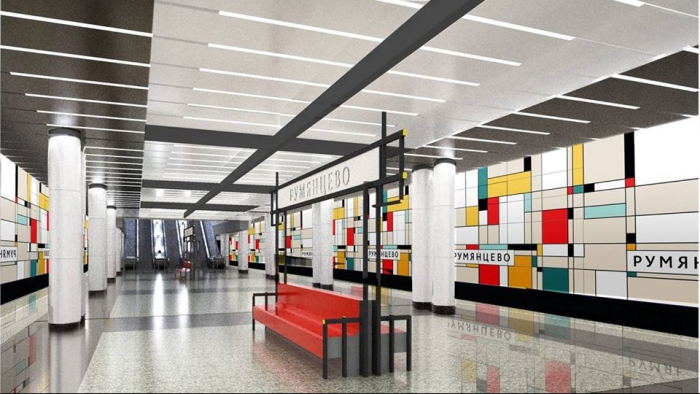 Строящаяся станция Сокольнической линии московского метро «Румянцево» будет оформлена в стиле геометрического абстракционизма. В отделке станции появятся гранитный цоколь из черного габбро (строительный материал, используемый для фасадов зданий), а также стеклянные витражи с абстракциями голландского живописца Пита Мондриана.