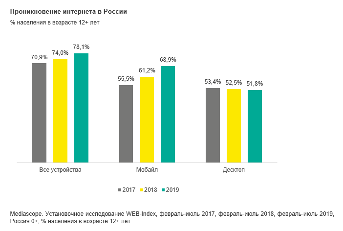 Согласно данным Российской ассоциации электронных коммуникаций (РАЭК), в 2019 году совокупная аудитория Рунета выросла до 96,9 млн человек, а уровень проникновения интернета среди населения составил 78,1%. Мобильная аудитория также показала рост — в этом году она достигла 85,2 млн человек.