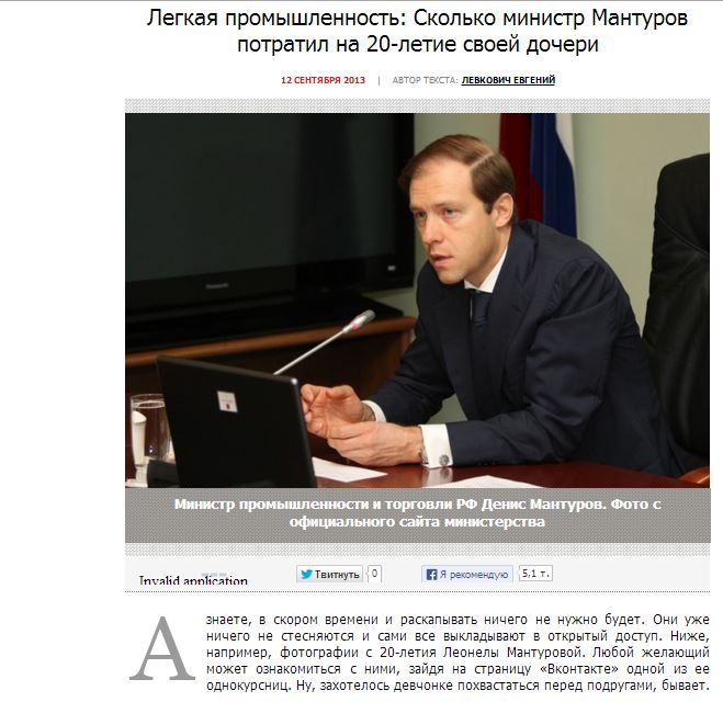Сегодня пользователи Рунета активно обсуждают легкую промышленность и сумму, которую глава Минпромторга Денис Мантуров потратил на 20-летие своей дочери. Поводом для дискуссий стал материал в журнале Rolling Stone. Автор Евгений Левкович выложил фотографии с юбилея, как он утверждал, Леонелы Мантуровой. В настоящее время статья удалена и доступна только в кэше поисковых систем.