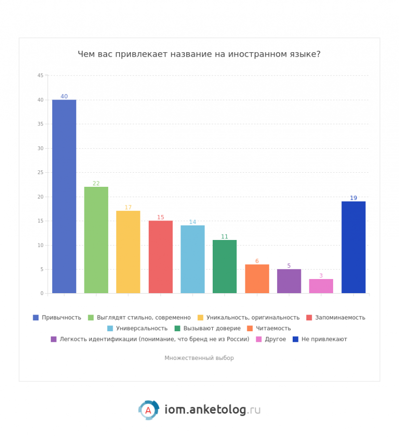 Среди плюсов иноязычных названий чаще всего называют привычность (40%), стиль (22%) и уникальность (17%). По мнению 15% опрошенных, названия на других языках лучше запоминаются. 14% респондентов заявили, что такие наименования «универсальны», а у 11% они «вызывают доверие».