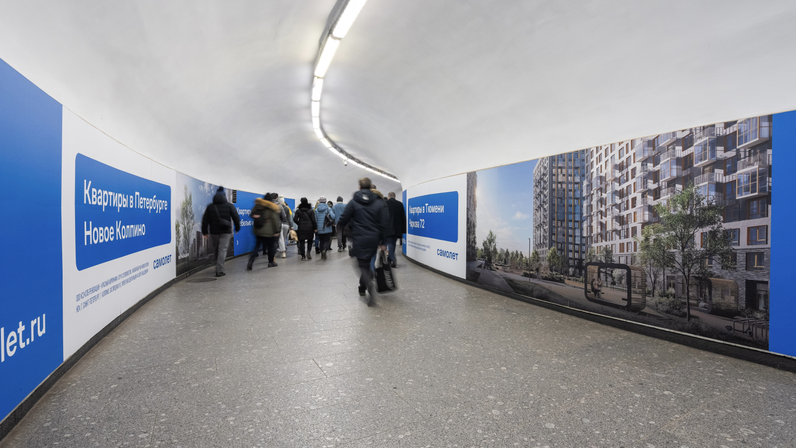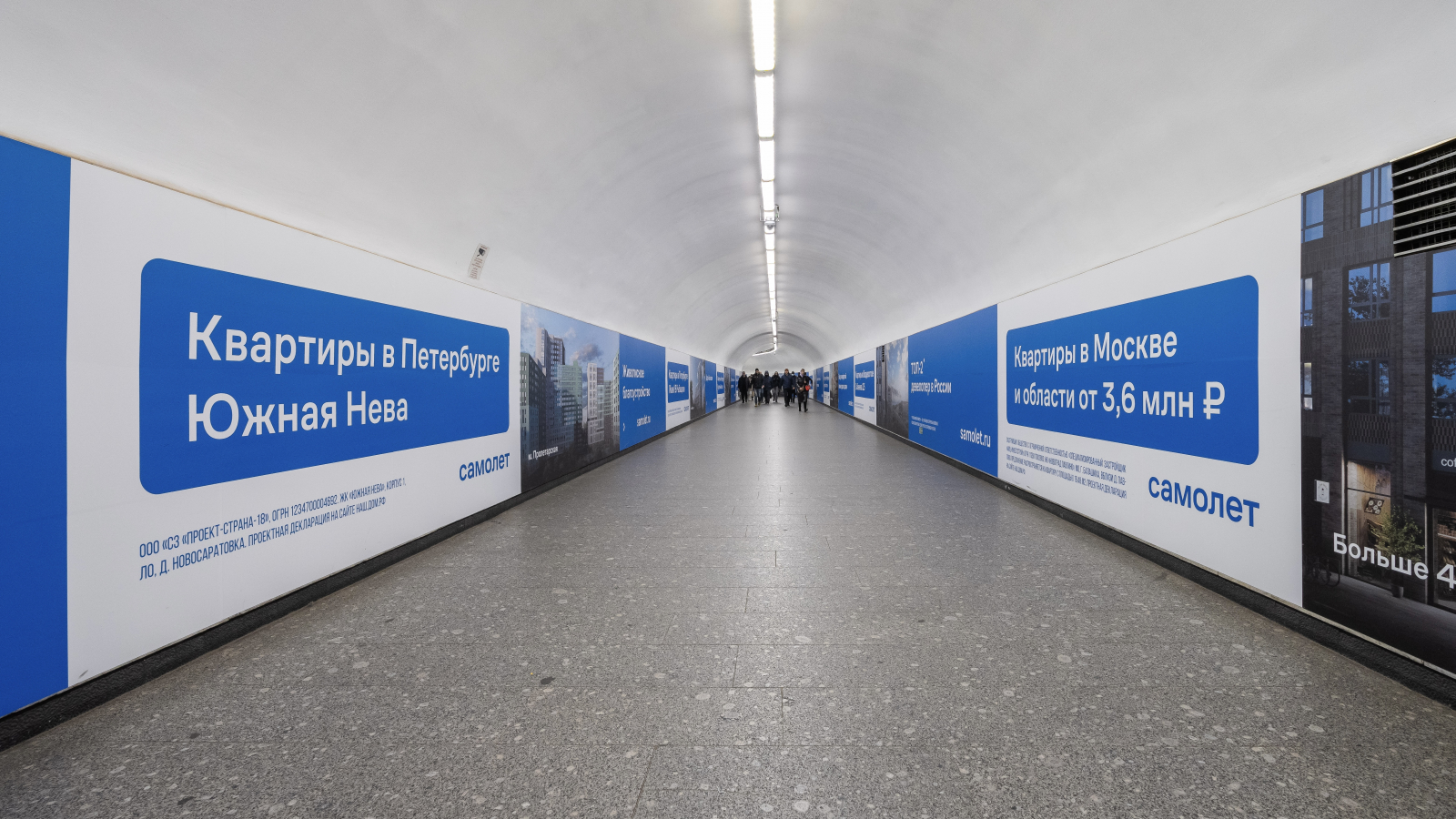 В рамках рекламной кампании девелопера «Самолет» группа Russ забрендировала подземный переход между станциями «Гостиный двор» и «Невский проспект» в метро Санкт-Петербурга. Об этом Sostav рассказали представители Russ.