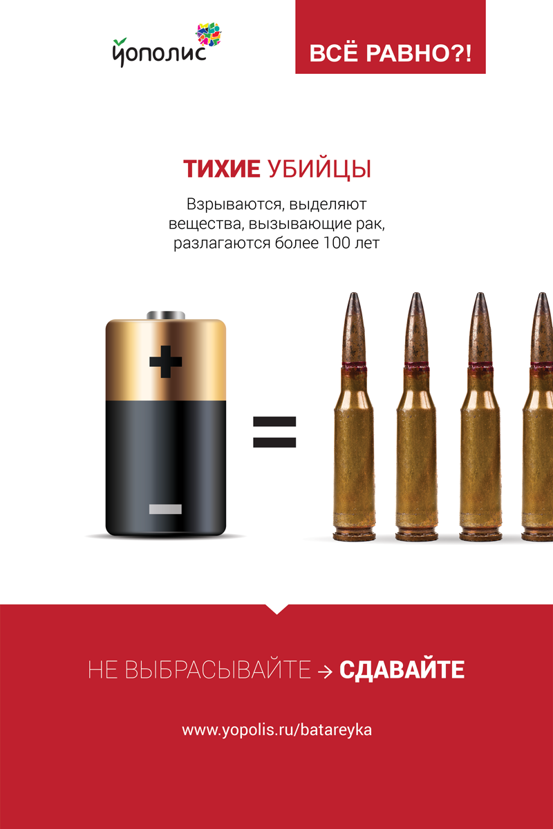 Задачу наглядно объяснить населению, почему и куда необходимо сдавать отработавшие батарейки, взяли на себя интернет-платформа «Йополис» и компания Russ Outdoor. Социальная реклама «Все равно?!» призывает жителей мегаполиса не оставаться равнодушными к собственному будущему, к состоянию окружающей среды и здоровью своих друзей и родных.