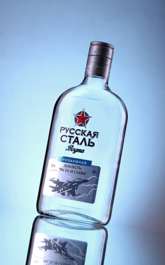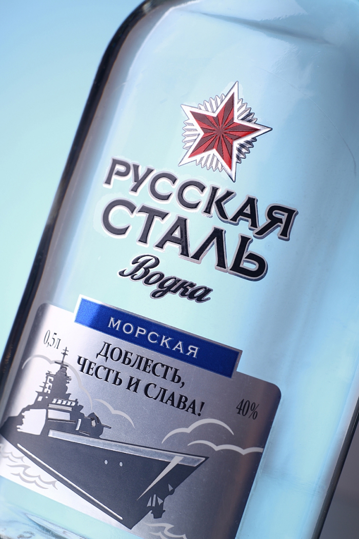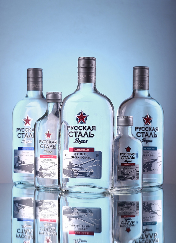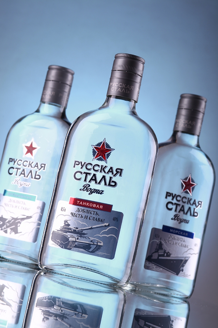 Внутри линейки продукты дифференцируются по принципу привязки к трём стихиям – трём видам русской стали: на суше, на море, в воздухе. Дизайн этикетки усиливается за счёт формы бутылки, стилизованной под солдатскую фляжку.