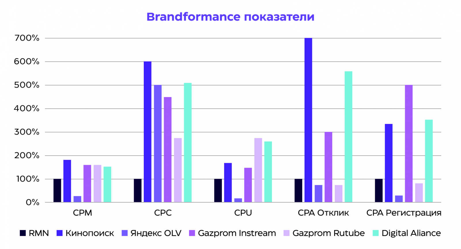 - В лидерах по количеству откликов на вложенный рубль. При одинаковом бюджете, RMN привёл в 3 раза больше откликов, чем Gazprom Instream, и почти в 6 раз больше, чем Digital Alliance.
