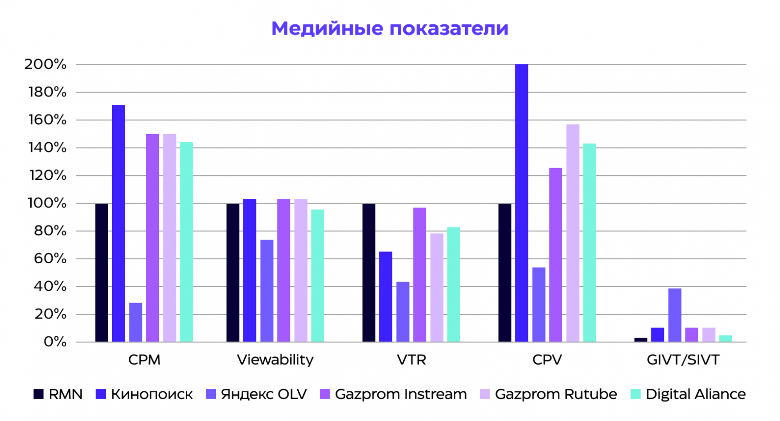 Параметры сравнения: CPM, VTR, CTR, Viewabillity, конверсия в целевые действия.