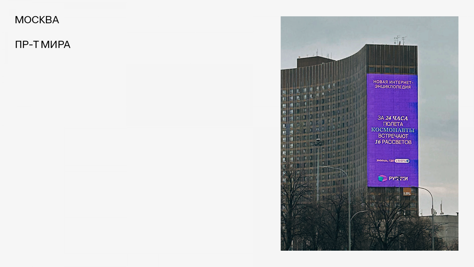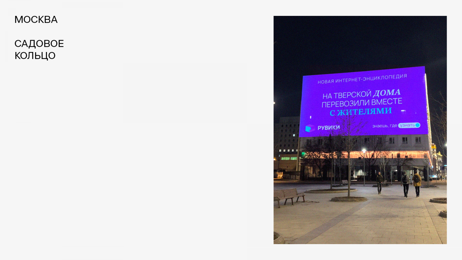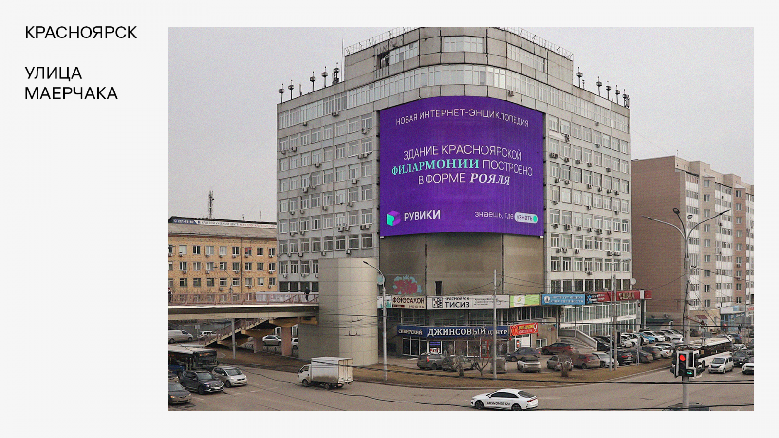 Было собрано больше 80 фактов о российских городах. Их разделили на федеральные (интересные для всех городов) и локальные (в каждом городе собраны любопытные факты о жизни и истории региона) и разместили на аутдор-конструкциях: билбордах, медиафасадах и пилларах. Макеты были оформлены в минималистичном дизайне.
