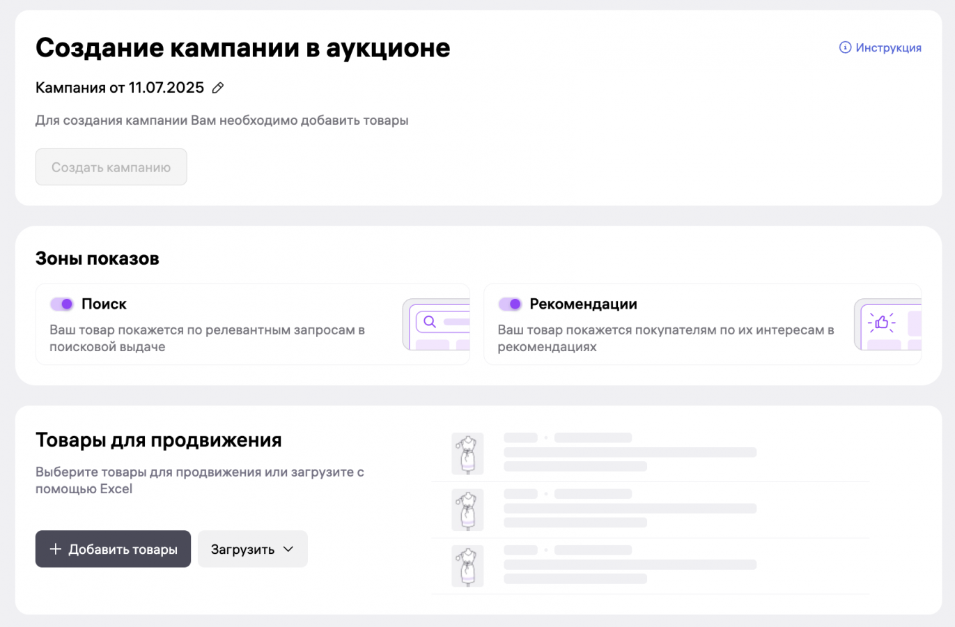В интерфейсе «Аукциона» можно выбрать зоны показа: поиск, рекомендательные полки или оба варианта одновременно. Можно установить отдельно ставку для продвижения в поиске и отдельно — для рекомендательных полок, что позволит оптимизировать бюджет и сосредоточиться на наиболее эффективных местах размещения. Для рекомендательных полок, как и в «Автоматической кампании», будет действовать понижающий коэффициент стоимости.