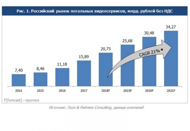 Согласно прогнозам аналитиков, к 2021 году доходы рынка легальных видеосервисов могут увеличиться до 34,3 млрд руб. При этом среднегодовой темп прироста в 2018—2021 годах составит 21%.