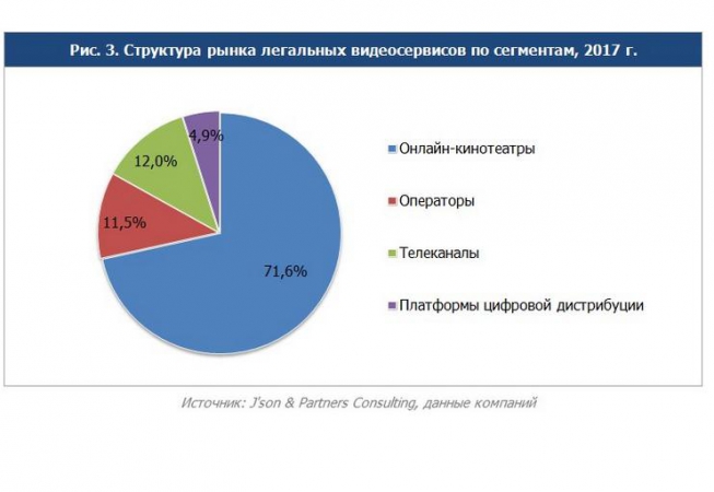 За 2017 год список операционно прибыльных компаний снова увеличился. Онлайн-кинотеатры заняли долю рынка в 71,6%, что составило 11,37 млрд. рублей. Телеканалы нарастили долю рынка до 12% (до 1,91 млрд. рублей) и переместились на второе место. Доля рынка операторов составила 11,5% (1,83 млрд. рублей). Платформы цифровой дистрибуции заработали 780 млн. рублей.