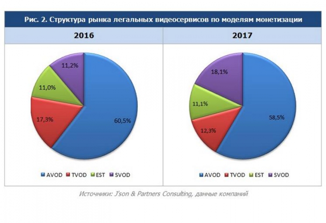 В 2017 году объем российского рынка легальных видеосервисов достиг 15,89 млрд. рублей, прибавив 42% к показателям предыдущего года. Общая выручка игроков по рекламной модели выросла на 37,3%, а по всем платным моделям — на 49,6%, сообщается в исследовании J’son & Partners Consulting.