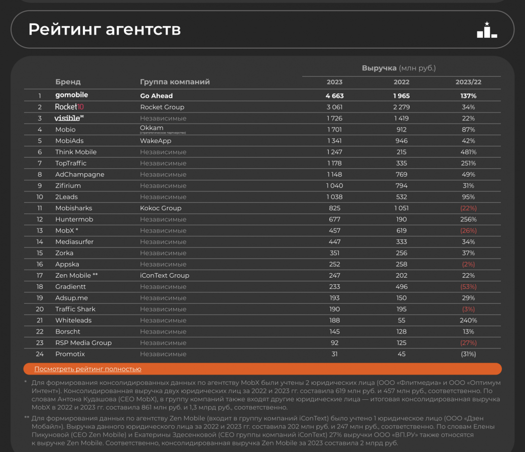 Авторы исследования указывают, что оценка игроков рынка происходила с учётом данных из открытых источников о выручке и чистой прибыли. Всего в список вошли 24 российских мобильных агентства.