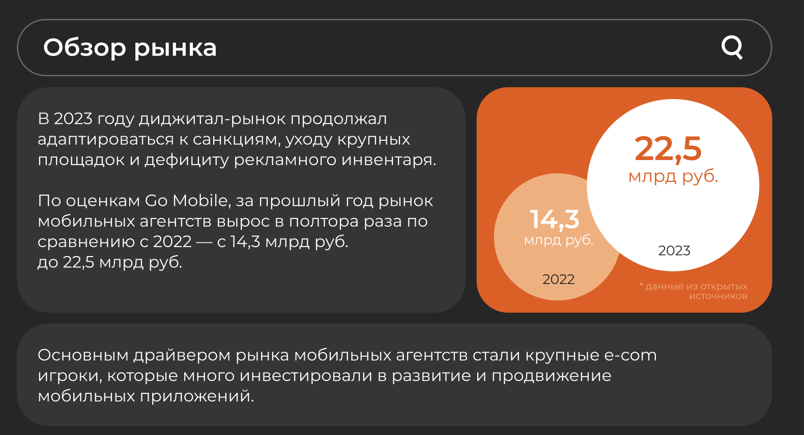 По оценкам Go Mobile, за 2023 год рынок мобильных агентств вырос в 1,5 раза по сравнению с 2022 и составил 22,5 млрд руб. против 14,3 млрд руб.