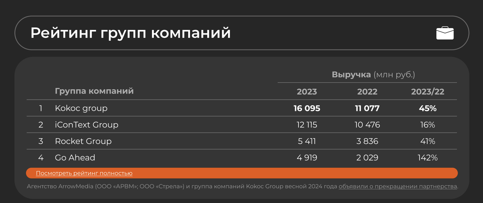 Kokoc Group (16,1 млрд руб.), в который входит мобильное агентство Mobisharks.