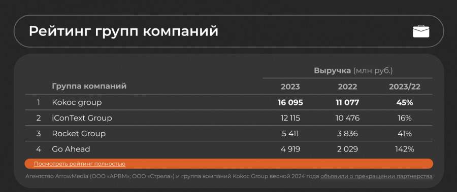 iConText Group с агентством Zen Mobile (12,1 млрд руб.), третье — Rocket Group и агентство Rocket10 (5,4 млрд руб.). На четвертой позиции расположился