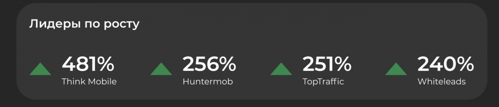 Всего 17 из 24 мобильных агентств показали положительную динамику по выручке. Лидерами по росту стали Think Mobile (481%), Huntermob (256%), TopTraffic (251%),