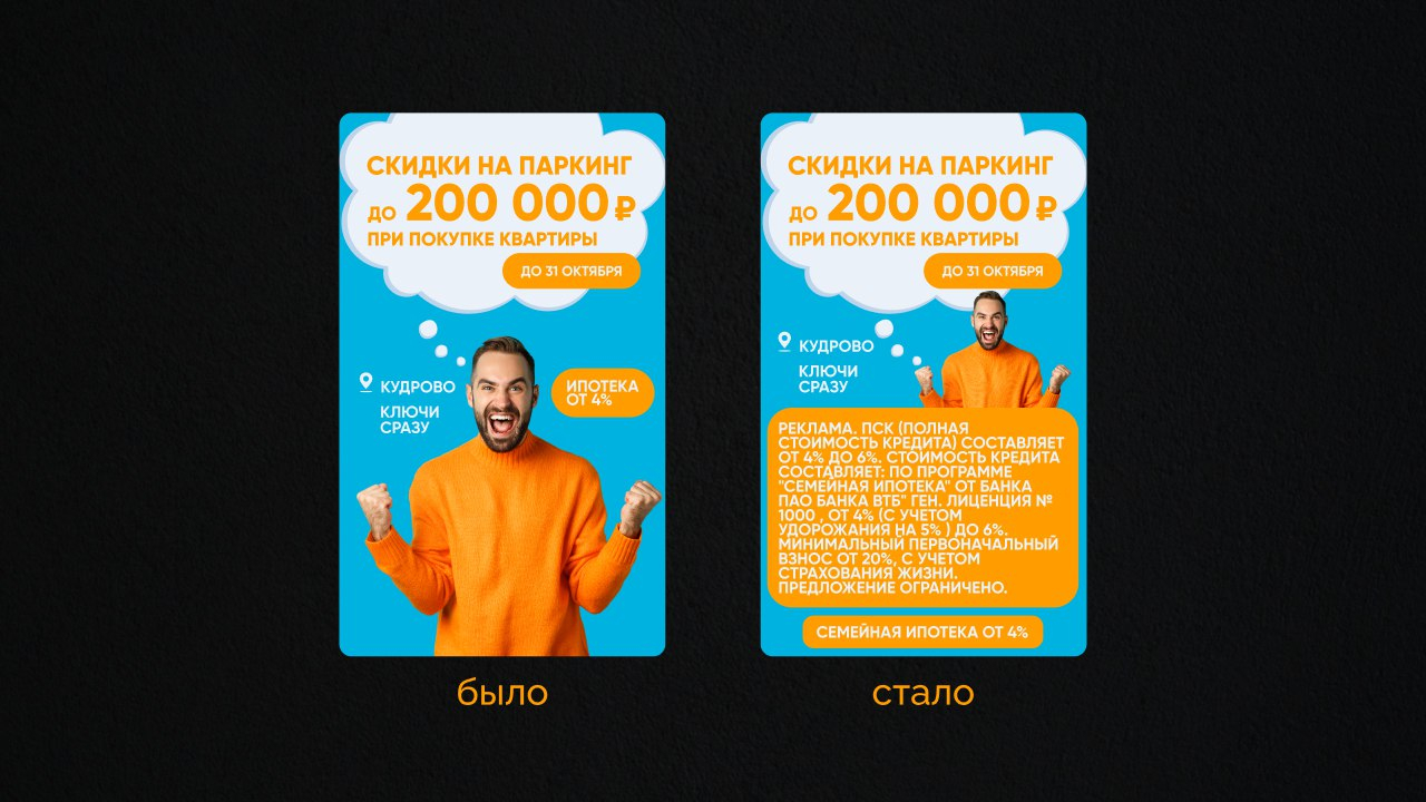 Теперь рекламные материалы застройщика должны содержать информацию о полной стоимости кредита. Сюда относятся не только рекламные креативы, но и сайт, лендинги, посадочные страницы и так далее. Следующим шагом может стать предложенный депутатами законопроект, обязывающий застройщиков выполнять полный объём работ, указанный на рендерах и прочих рекламных материалах. Любое несоответствие будет означать нарушение этого закона.