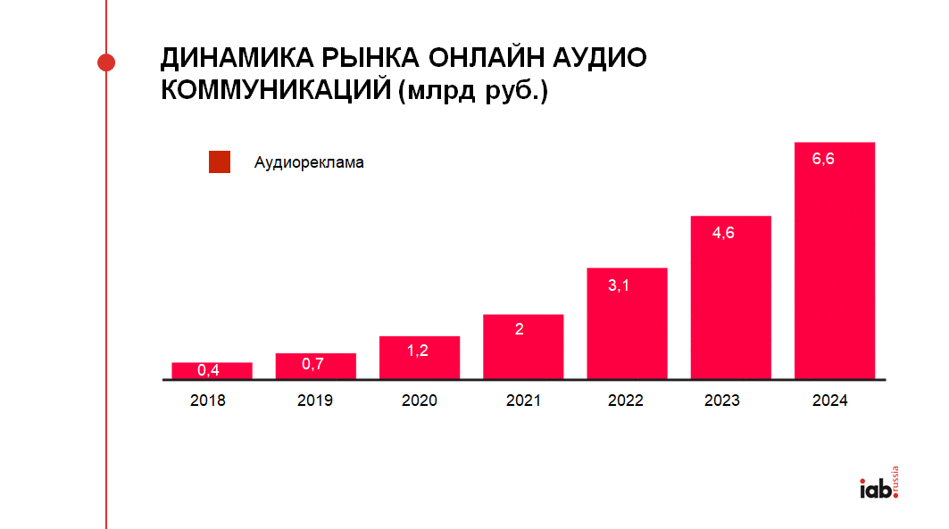 Российский рынок онлайн-аудиокоммуникаций — музыка, подкасты, аудиокниги — к 2024 году составит 6,6 млрд рублей, тогда как в 2019 году эта цифра находилась на уровне 0,7 млрд рублей. К такому выводу пришли в IAB Russia (Interactive Advertising Bureau). Согласно прогнозу, в 2020 году этот рынок достигнет объема в 1,2 млрд рублей, в 2021-м — 2 млрд рублей, в 2022-м — 3,1 млрд рублей, а уже в 2023 году будет на уровне 4,6 млрд рублей.