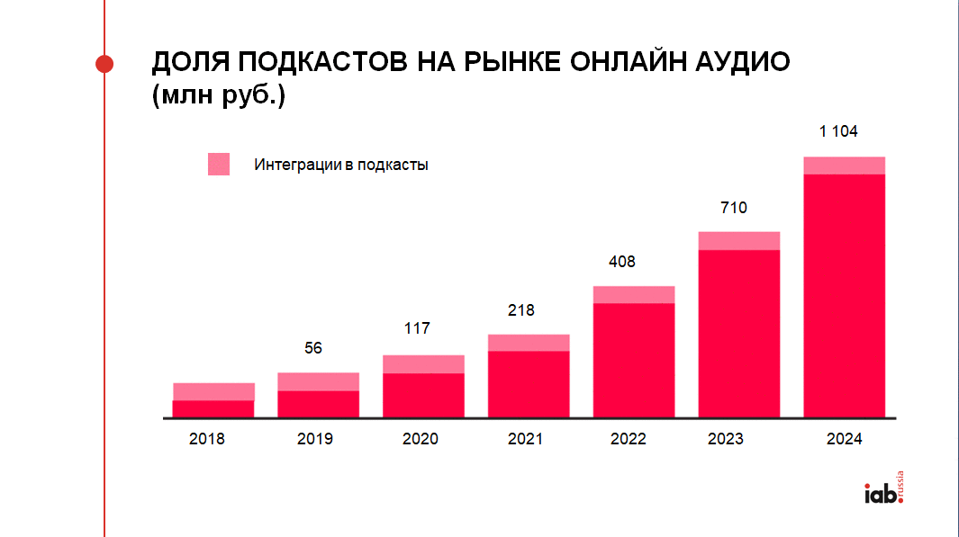 В 2019 году объём рынка подкастов составил только 56 млн рублей, однако, как прогнозируют в IAB Russia, в 2020 году этот сегмент должен вырасти более чем в два раза — до 117 млн рублей. В 2024-м эта цифра и вовсе достигнет 1,04 млрд рублей.