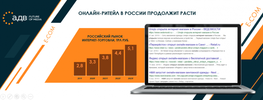 По итогам 2019 года объем российского рынка электронной коммерции составит 2,8 трлн руб., а в перспективе 2020 года эта цифра должна вырасти до 3,3 трлн руб. В 2023 году рынок и вовсе должен достигнуть показателя в 5,1 трлн руб.