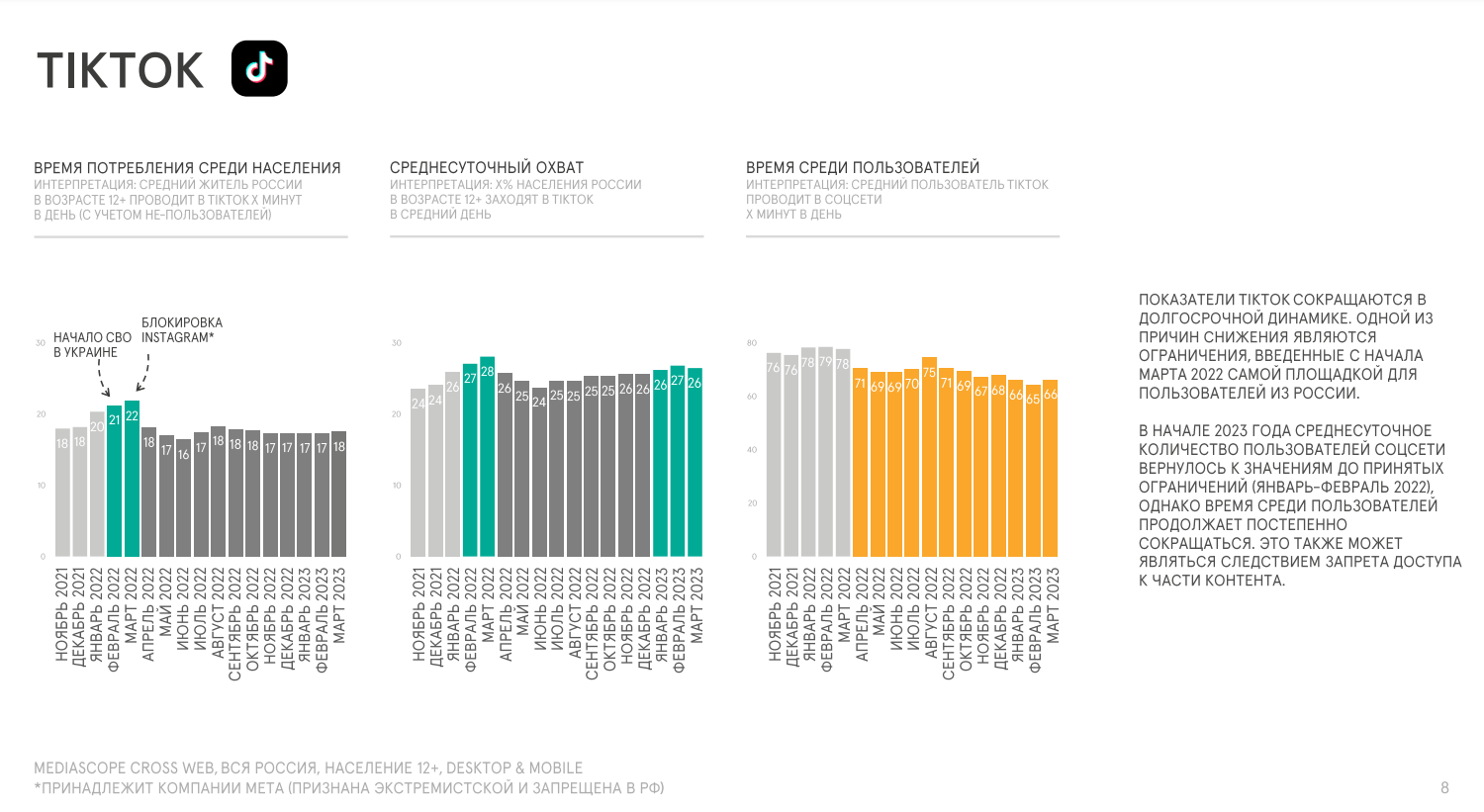 В 2022 году произошло перераспределение пользователей между иностранными и российскими ресурсами. По данным Мediascope, TikTok остаётся в числе первых по популярности социальных сетей в России, а пользователи ежедневно уделяют соцсети больше часа. Однако это время сокращается. Год назад TikTok ввёл ограничения для пользователей из России, и до этого времени россияне проводили на площадке практически 80 минут в день. Оценить общее число россиян в TikTok сегодня сложно — после введения ограничений пользователи начали заходить в соцсеть при помощи VPN.
