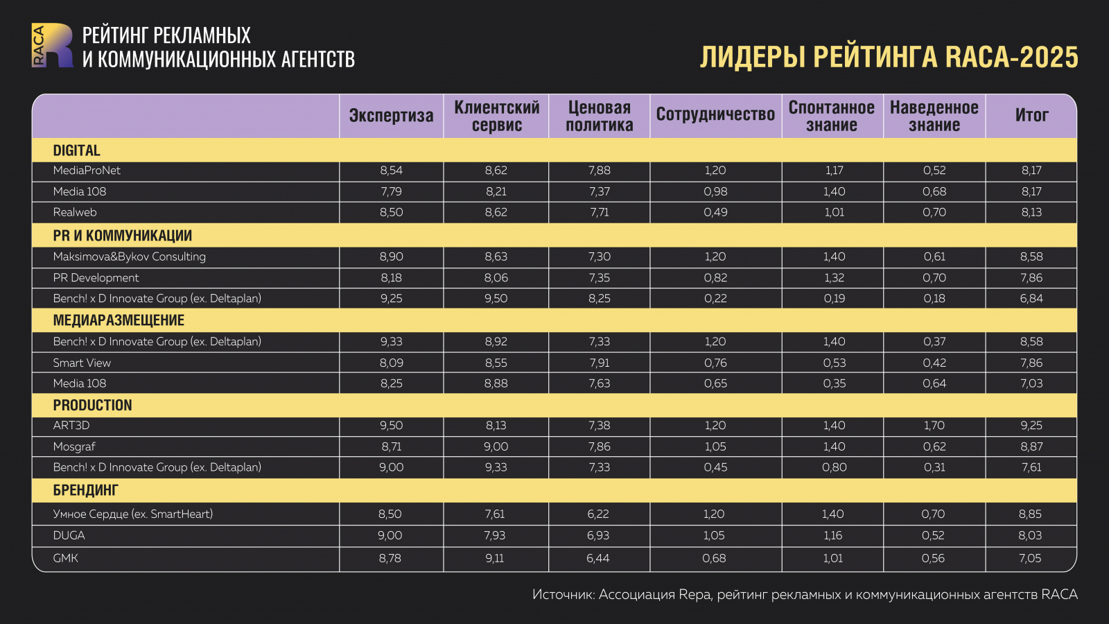 Данные RACA показывают, что конкурентное преимущество сместилось от простого объема клиентской базы к комбинации экспертизы, открытости и репутации. Яркий пример — успех агентства Bench! х