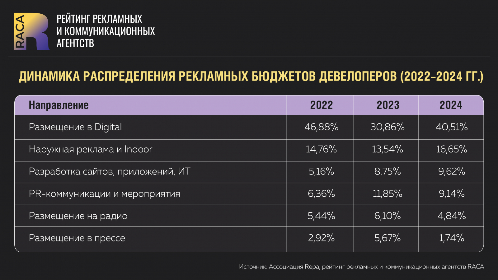 Самый яркий провал: традиционная пресса для девелоперов умерла. Ее доля рухнула до 1,7% — рынок голосует рублем за измеримую эффективность и отказался от неработающих форматов.