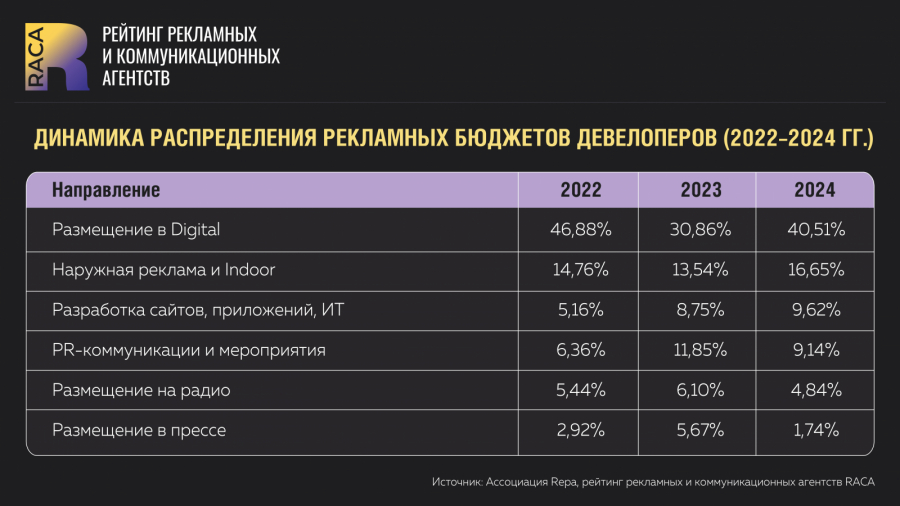 Диджитал захватывает 40% рекламных бюджетов девелоперов, а вложения в прессу упали до 1,7%. Наружная реклама держит оборону, но главный тренд — не каналы, а принципы: теперь в лидерах агентства, которые вкладывают в прозрачность и репутацию, а не только в объемы. Рынок голосует рублем за измеримую эффективность и открытость. Команда RACA поделилась результатами проведенной аналитики с Sostav.