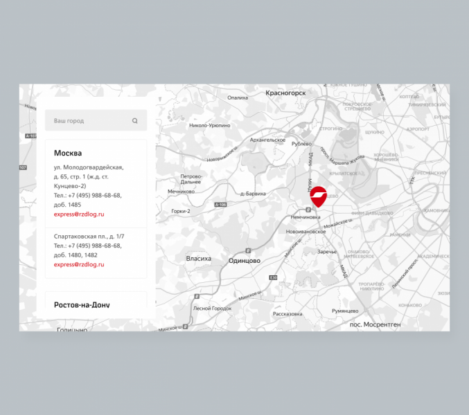 Адреса и телефоны офисов РЖД были размещены на кастомизированной под клиента «Яндекс.Карте» — вместо привычных геометок на неё нанесли брендированные.