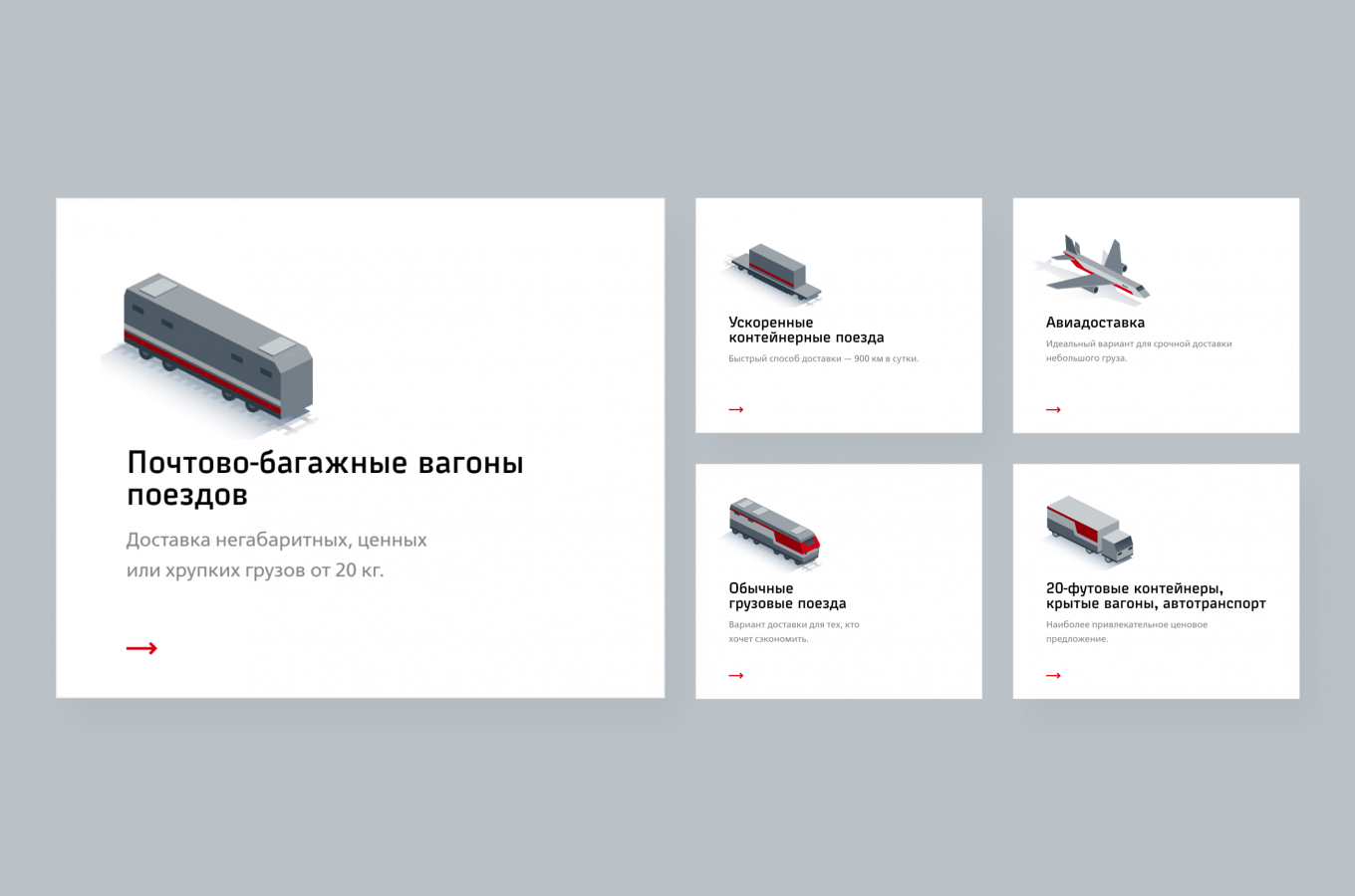 На экране «Способ доставки» наглядно продемонстрированы все возможные способы доставки в рамках услуги «РЖД Экспресс», чтобы пользователь мог выбрать для себя подходящий и узнать о нем подробно. Рядом — пошаговые гайды по отправке и принятию грузов.