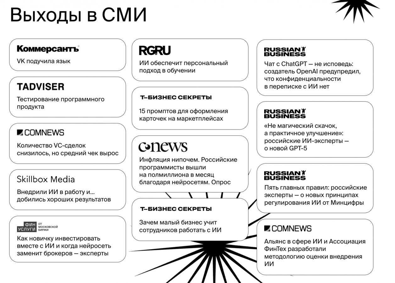 Материалы выходили в «Ведомостях», «Инк.», «Газете.ru», Lenta.ru, РБК Pro, IT-World, ComNews, Techinsider и других медиа. А издание Off Magazine опубликовало авторскую колонку про использование ИИ в разных отраслях в печатном издании в специальном выпуске, приуроченном к ВЭФ 2025.