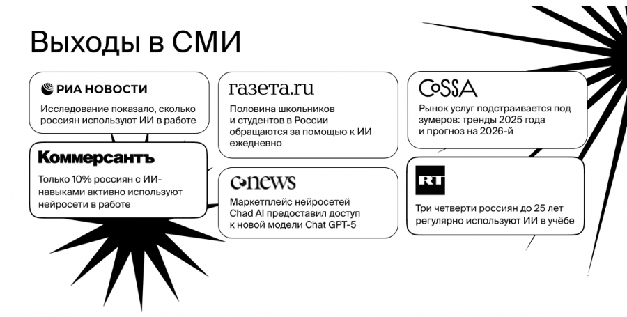 Ключевым инструментом для масштабирования охватов стали исследования. Команда анализировала обезличенные запросы пользователей в нейросетях и упаковывала интересные инсайты в новости. Такой формат позволял встраивать бренд в обсуждение общественно значимых тем — образования, рынка труда и цифровых навыков. Например, перед началом учебного года chad рассказал «Газете.ru», для решения каких задач школьники используют ИИ.