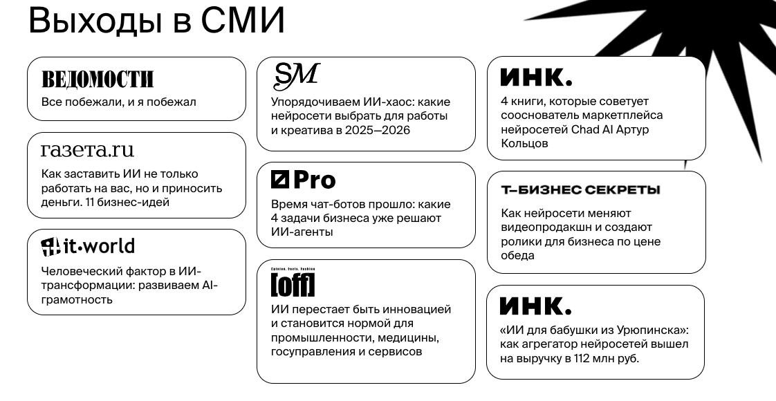 chad вошел в топ-3 маркетплейсов нейросетей по охватам и количеству упоминаний в СМИ среди основных конкурентов по версии «Медиалогии», что позволило проекту закрепиться в одном ряду с крупнейшими игроками сегмента и повысить доверие со стороны B2B-аудитории.