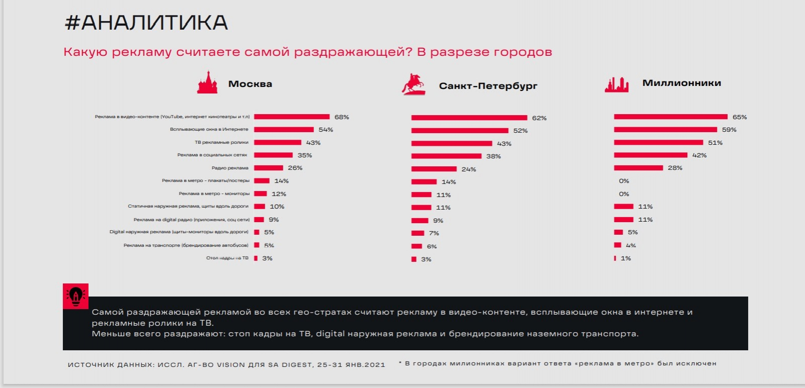 SA Media Group и Vision выяснили, какая реклама привлекает больше всего внимания. В исследовании, проведенном в феврале, приняли участие жители Москвы, Санкт-Петербурга и городов-миллионников в возрасте от восемнадцати лет.