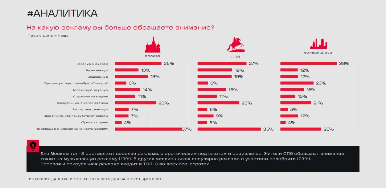 На вопрос «На какую рекламу вы обращаете больше всего внимания?» 33% ответили, что в принципе не обращают внимания на рекламу. На втором месте по популярности оказался ответ «На веселую, с юмором» — такие промо замечают 30% опрошенных. Сексуализированная реклама не оставила равнодушными 22% респондентов. Далее следуют социальная реклама (16%), «аппетитная, вкусная» и музыкальная (15%), в которой присутствуют звезды или красивые виды (11%) и эксперты (6%). На «трэш» реагируют лишь 4% респондентов.