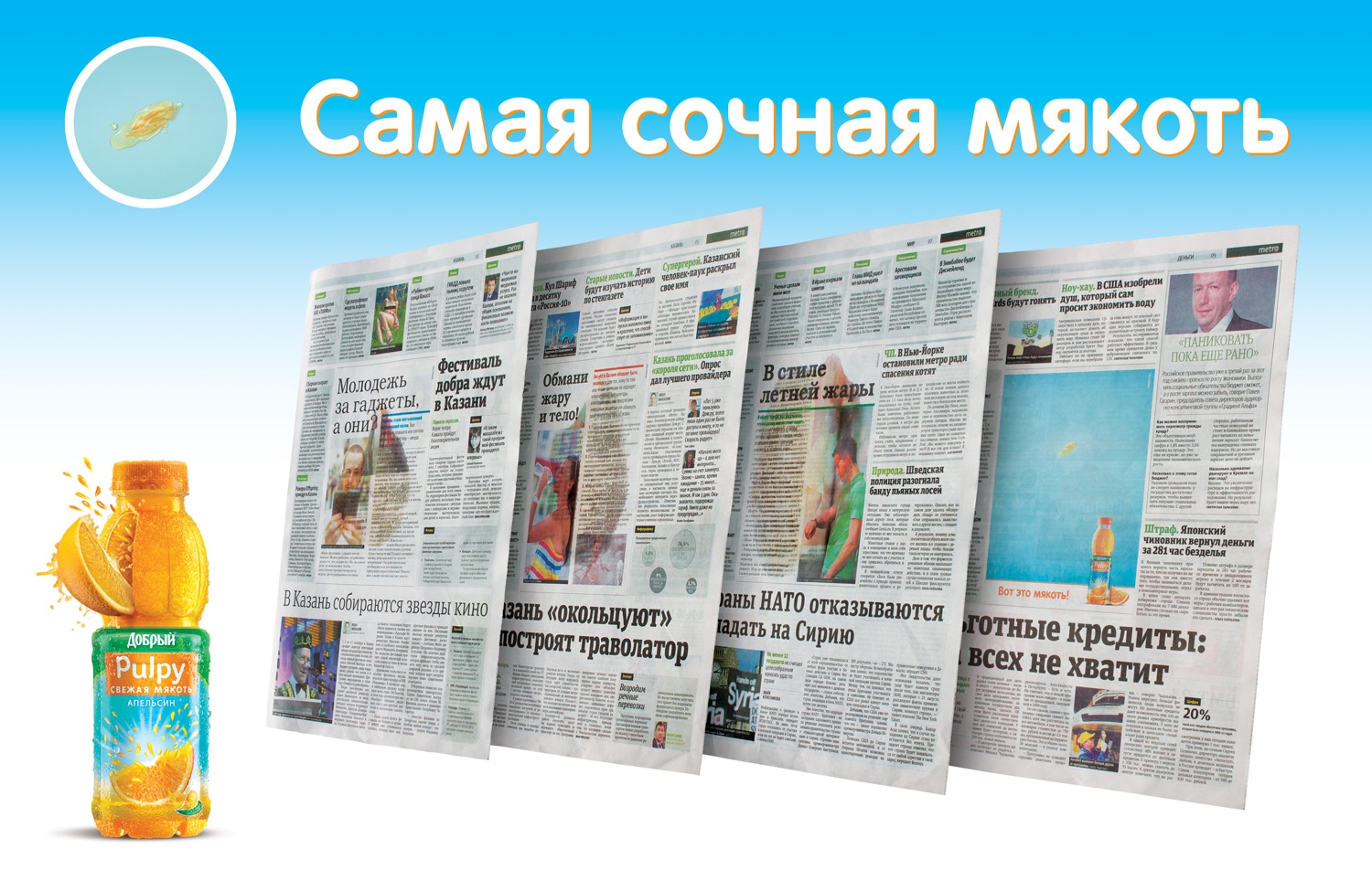 Открыв газету, читатель неожиданно наталкивается на то, что на одной из страниц оказалось очень реалистичное пятно от сока. На следующей странице пятно становится более отчетливым, что вызывает еще большее недоумение читателя. На третьей странице не представляется возможным даже разглядеть написанное из-за размытого текста. Перелистнув страницу, читатель видит, что это пятно от сочной мякоти напитка Pulpy, рекламный принт которого размещен в газете со слоганом «Вот это мякоть!».