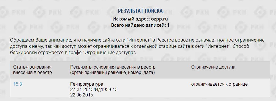 Роскомнадзор ограничил доступ к сайту Общества защиты прав потребителя (ОЗПП). Согласно реестру, интернет-ресурс Ozpp.ru заблокирован по требованию Генпрокуратуры. Хотя там указано, что доступ ограничивается только к одной странице, провайдеры блокируют весь сайт.