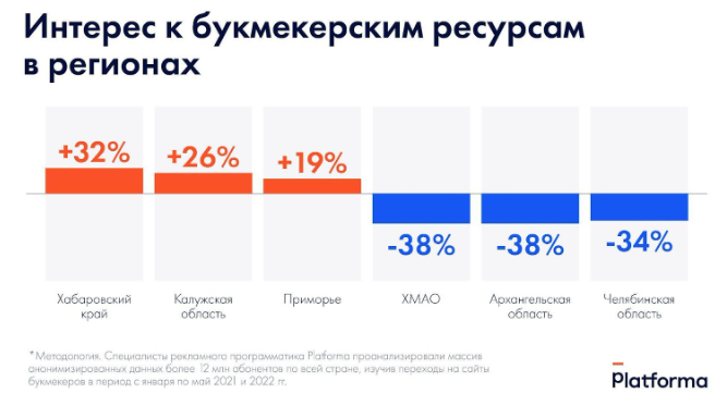 Наиболее заметно интерес к букмекерским ресурсам увеличился в Хабаровском крае — на 32%, Калужской области — на 26% и Приморье — на 19%. Снижение интереса к подобным сайтам сильнее всего проявилось в ХМАО — на 38%, Архангельской — на 38% и Челябинской — на 34% областях.