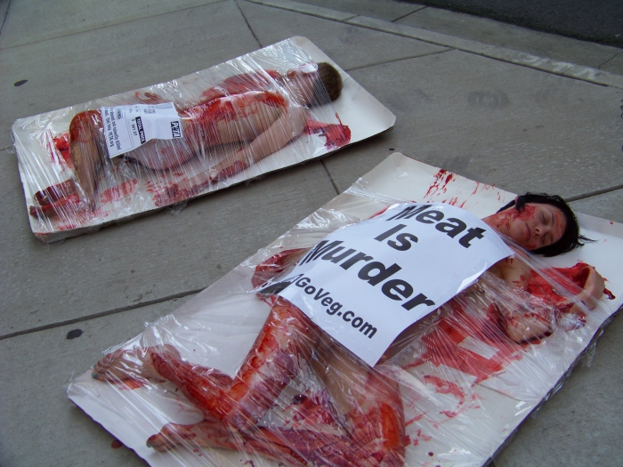Акция «Человечина на подложке» (Human Meat Tray) проводилась в городах по всему миру. Ее участники раздеваются, мажутся искусственной кровью и изображают мясо в магазинной упаковке.