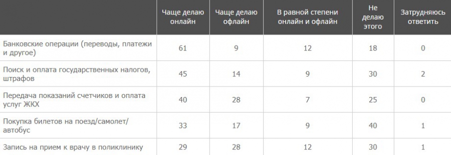 40% респондентов передают показания счетчиков и оплачивают услуги ЖКХ. Треть опрошенных заявили, что покупают через интернет билеты на поезда и самолеты. Это 42% населения среди 18−24-летних, а также 67% жителей обеих столиц. Еще 29% участников опроса записываются к врачу онлайн и покупают билеты в кино или на концерты.