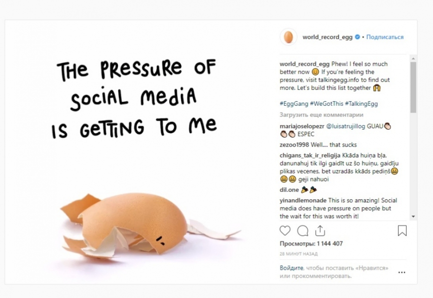 Первая фотография яйца появилась в аккаунте 4 января 2019 года. Подпись под ним призывала ставить лайки, чтобы яйцо стало самым популярным. Пользователям сетей эта мысль пришлась по вкусу, так что за несколько дней снимок яйца набрал 50 млн лайков.