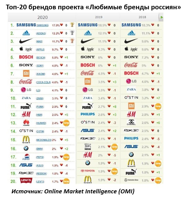 Пятерку любимых российских брендов в 2020 году составили Samsung, Adidas, Nike и Apple и Bosch. Первый возглавляет рейтинг с 2011 года, следует из опроса Online Market Intelligence (OMI).